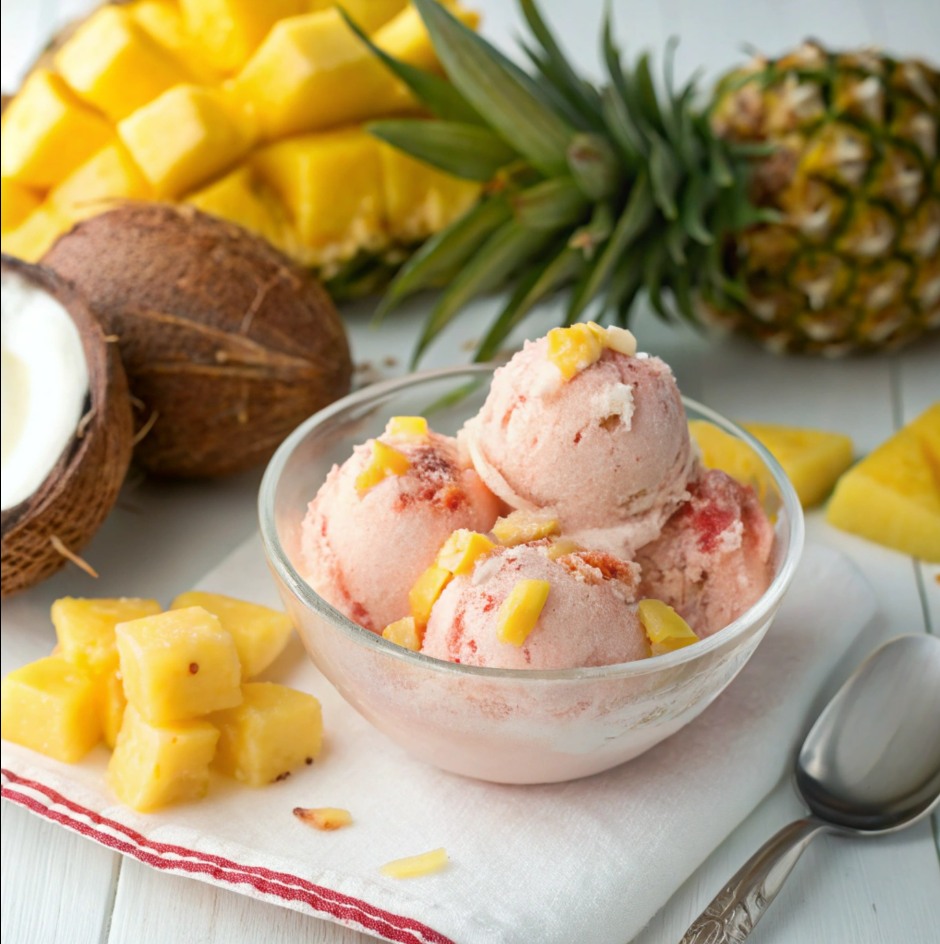 Ananas-Kokos-Sorbet Zutaten: – 400 g Ananasstücke (frisch oder gefroren) – 100 ml Kokosmilch – 1 EL Honig Zubereitung: 1. Alle Zutaten miteinander vermischen. 2. Sofort servieren oder für eine festere Konsistenz 2 Stunden einfrieren. Fortsetzung auf der nächsten Seite