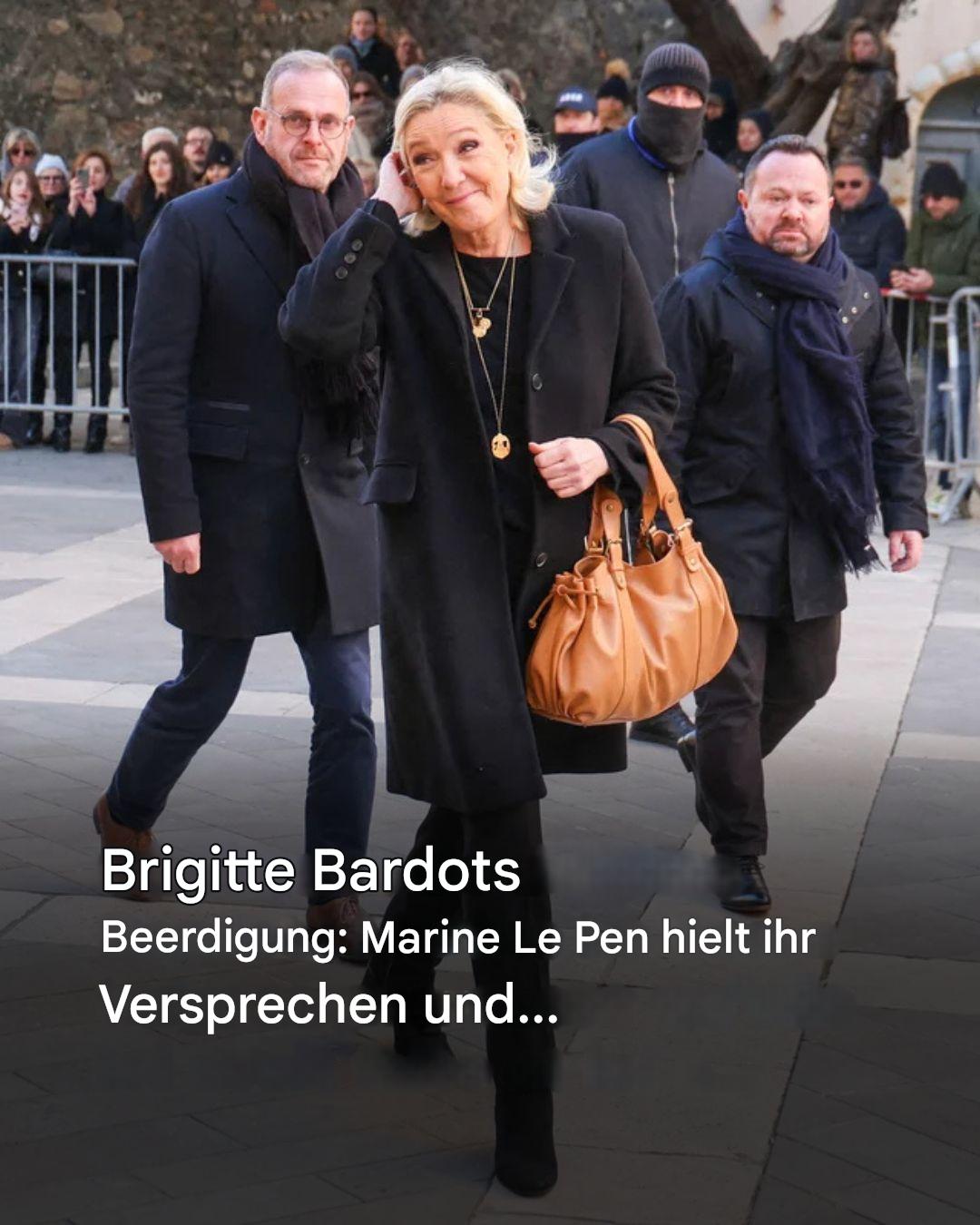 Die Beerdigung von Brigitte Bardot fand am Mittwoch, dem 7. Januar, in Saint-Tropez statt. Zahlreiche Prominente nahmen Abschied von der französischen Filmikone. Auch Marine Le Pen, sichtlich bewegt, erwies der Schauspielerin die letzte Ehre, wie sie gegenüber Nice-Matin erklärte .
