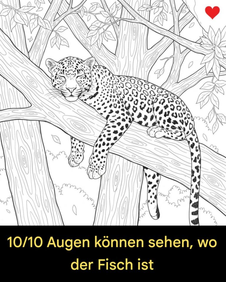 Das Bild zeigt einen majestätischen Leoparden, der sich auf einem Ast ausstreckt , umgeben von den feinen Details des Waldes. Auf den ersten Blick wirkt es wie ein schlichtes Kunstwerk – doch es gibt eine überraschende Wendung. Irgendwo im Bild versteckt sich ein Fisch , so geschickt mit dem Hintergrund verschmolzen, dass er leicht übersehen werden kann.