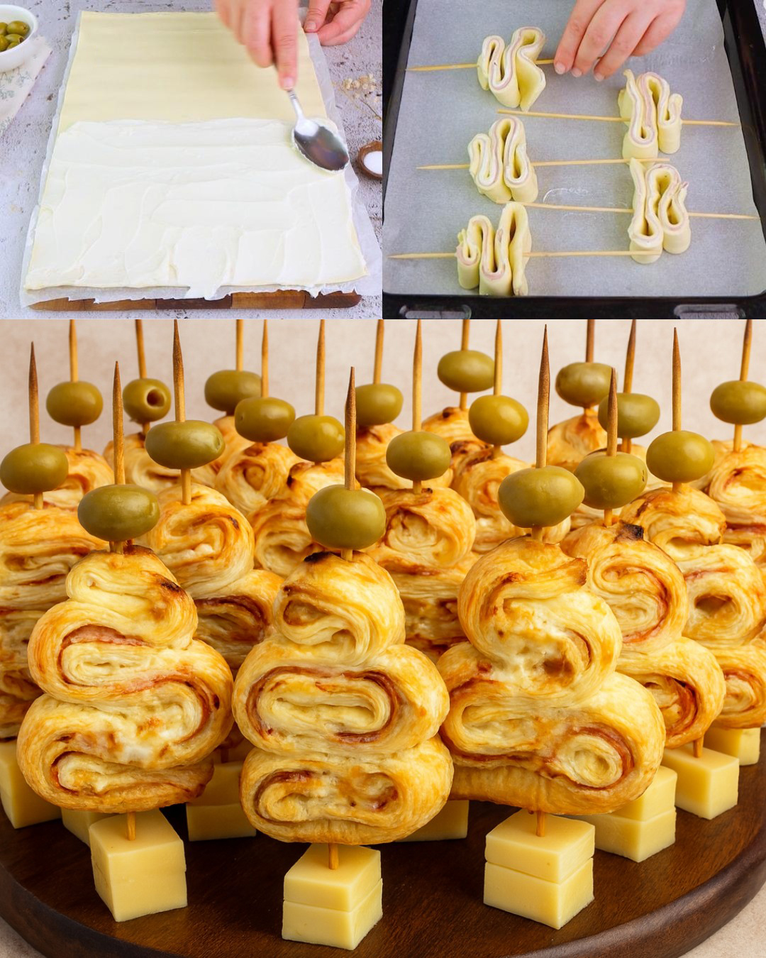 1. Blätterteig ausrollen. Frischkäse auf der oberen Hälfte verteilen, Schinken darauf legen.