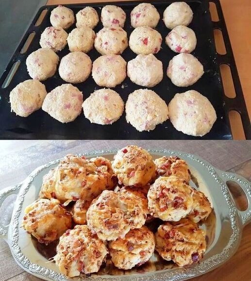 So geht es Zuerst das Mehl, Quark, Backpulver, Milch, Öl, Salz und Zucker gut verkneten. Dann die übrigen Zutaten zum Teig geben. Noch mal durchkneten und kleine Bällchen formen. Auf ein Backblech mit Backpapier legen.