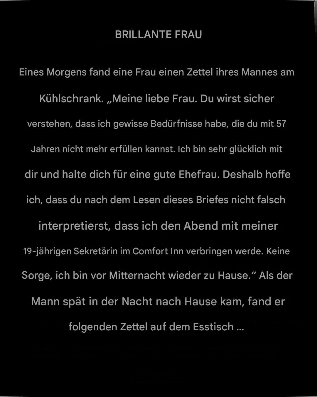 Meine liebe Frau, du wirst sicherlich verstehen, dass ich mit 57 Jahren gewisse Bedürfnisse habe, die du nicht mehr erfüllen kannst. Ich bin sehr glücklich mit dir und schätze dich als gute Ehefrau.