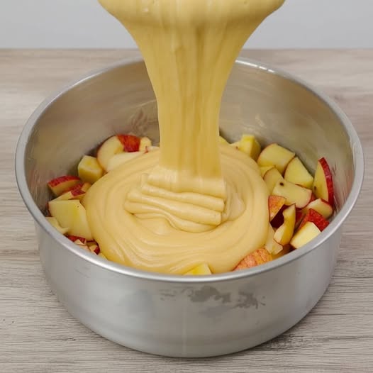 Äpfel waschen, entkernen und in kleine Stücke schneiden. Den Boden der Form damit auslegen.