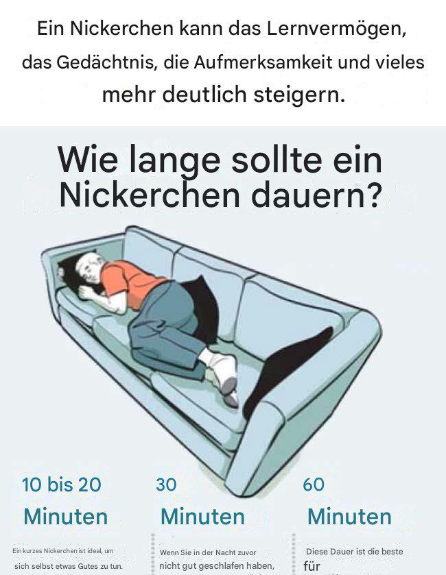 Schlafexperten erklären in dem Artikel, dass ein kurzes Nickerchen von 10 bis 20 Minuten den größten Nutzen bringt. Je nachdem, welche Art von Nickerchen man sich wünscht, können aber auch andere Dauern ideal sein. Für einen schnellen Energieschub, um die Konzentration und Aufmerksamkeit zu steigern, reicht laut Experten ein kurzes Nickerchen von 10 bis 20 Minuten aus, um schnell wieder arbeitsfähig zu sein.