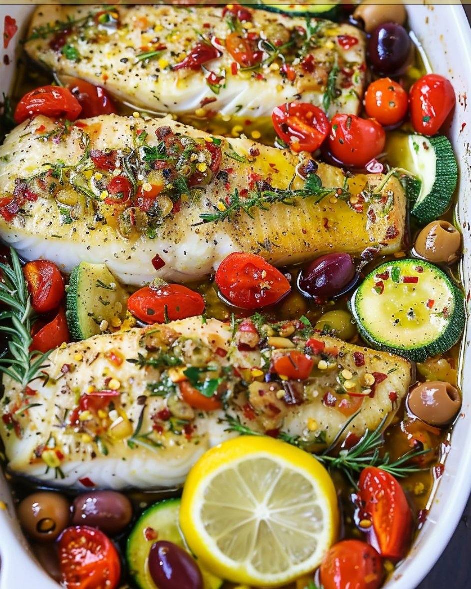 - Die Auflaufform aus dem Ofen nehmen und einige Minuten ruhen lassen. Den mediterranen gebackenen Fisch mit einer Beilage aus knusprigem Brot oder auf einem Bett aus Reis oder Couscous servieren, um die köstlichen Säfte aufzusaugen.