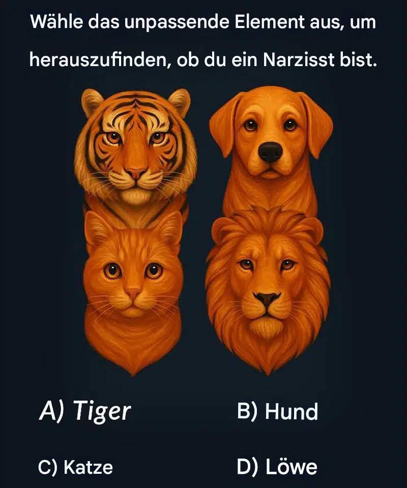 Auf den ersten Blick sieht dieses Bild wie ein einfaches Puzzle aus – vier Tiere, von denen eines nicht zu passen scheint: Tiger (A), Hund (B), Katze (C) oder Löwe (D). Aber laut populären Psychologie-Quizzen, die online kursieren, könnte das Tier, das du als das, das nicht dazu passt, aussagen, etwas Tieferes über deine Persönlichkeit aussagen – sogar auf Eigenschaften wie Selbstvertrauen, Empathie oder Narzissmus hindeuten.