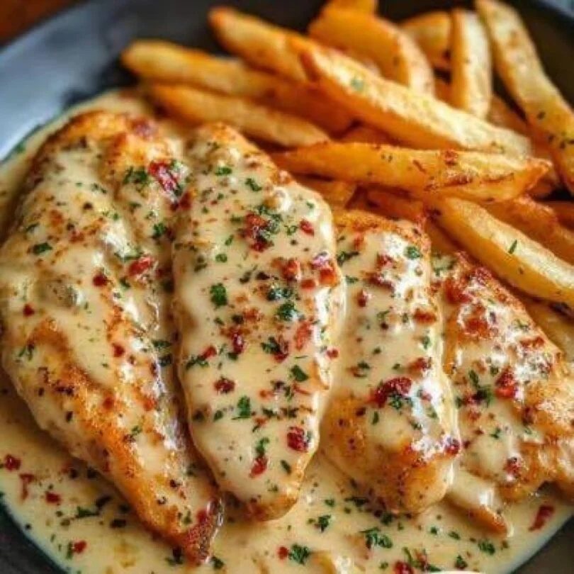 Serviere die Hähnchenfilets zusammen mit den knusprigen Pommes Frites. Gieße die cremige Knoblauchsauce großzügig über das Hähnchen und garniere das Gericht nach Belieben mit frischen Kräutern oder einem weiteren Streifen Parmesan.