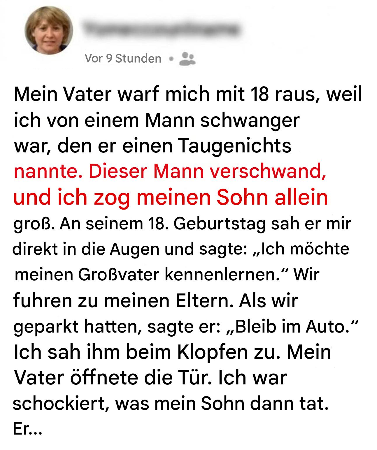 Manche Szenen brennen sich für immer in unser Gedächtnis ein: ein Blick, ein Satz, Stille, manchmal das einfache Zuschlagen einer Tür. Mit 18 Jahren hätte sie nie erwartet, dass ihre Welt innerhalb von Sekunden zusammenbrechen würde. Doch dieser schwere Moment sollte der Ausgangspunkt einer unerwarteten Wiedergeburt werden. Und fast zwanzig Jahre später ist es ihr Sohn, inzwischen ein junger Erwachsener, der an dieselbe Schwelle zurückkehrt und eine Botschaft überbringt, die weit mehr heilen kann als eine zerbrochene Vergangenheit.