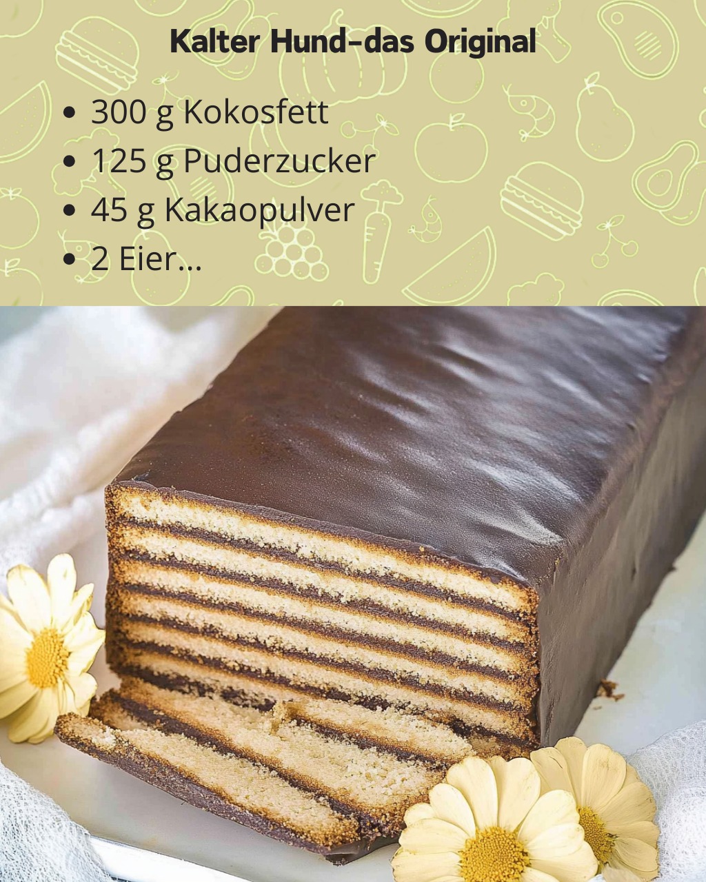 Kalter Hund – das OriginalZutaten: 300 g Kokosfett 125 g Puderzucker 45 g Kakaopulver 2 Eier 400 g Butterkekse Nächste→