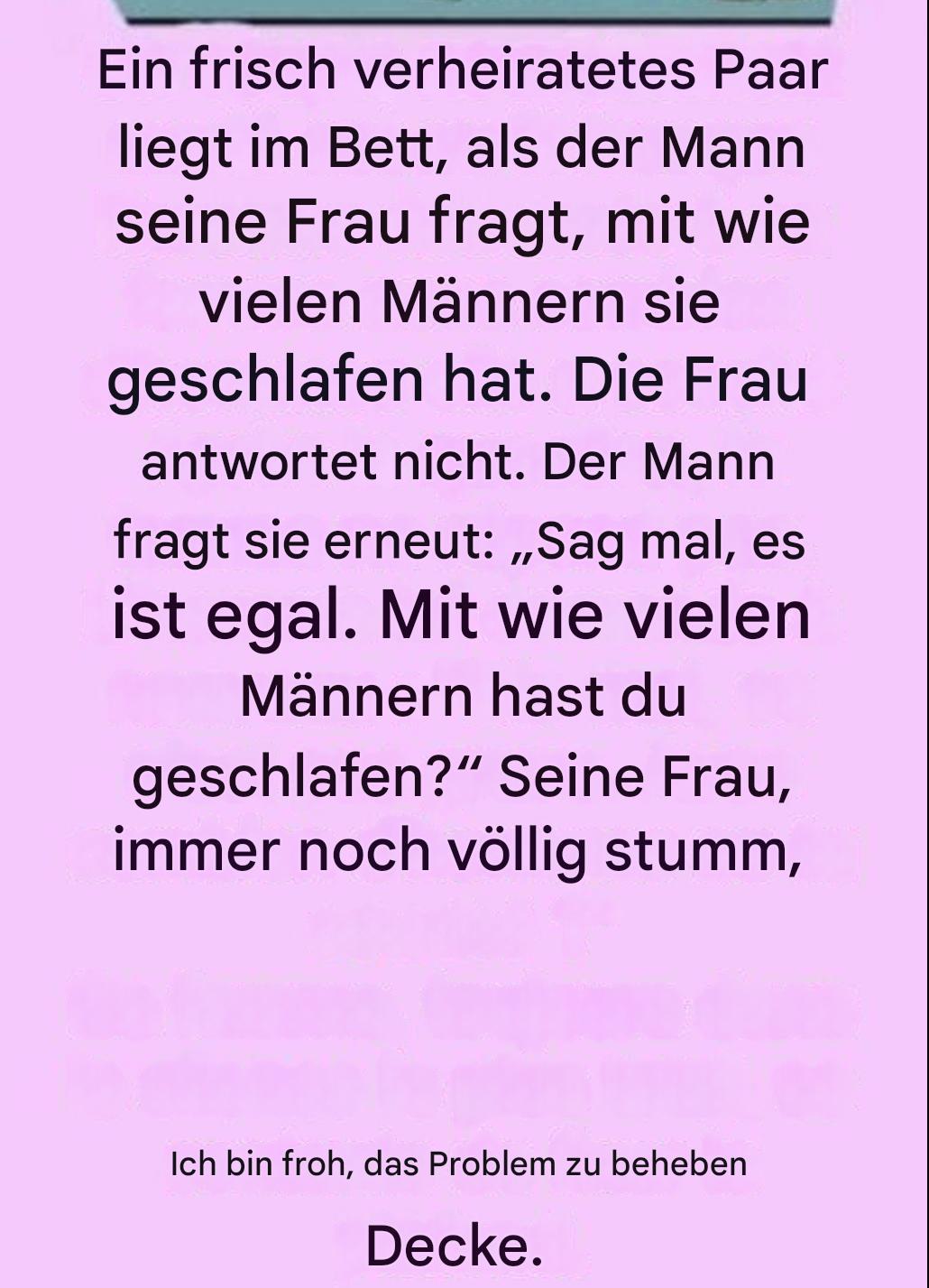 Frage Stellen Sie sich ein frisch vermähltes Paar vor, das es sich bequem in seinem Ehebett gemütlich gemacht hat. Alles scheint ruhig und gelassen, bis der Mann, von einer unbeholfenen Neugier getrieben, seiner Frau eine delikate Frage stellt: « Mit wie vielen Männern bist du vor mir ausgegangen? » Eine bedeutungsgeladene Frage, die ihren Partner zum Schweigen bringt, die Augen an die Decke geheftet, als suche sie die Antwort in den Sternen.