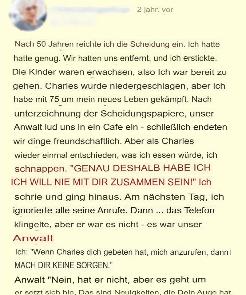 Charles war am Boden zerstört, aber ich kämpfte mit 75 für mein neues Leben. Nachdem wir die Scheidungspapiere unterschrieben hatten, lud uns unser Anwalt auf ein Café ein, und wir beendeten die Angelegenheit schließlich einvernehmlich.