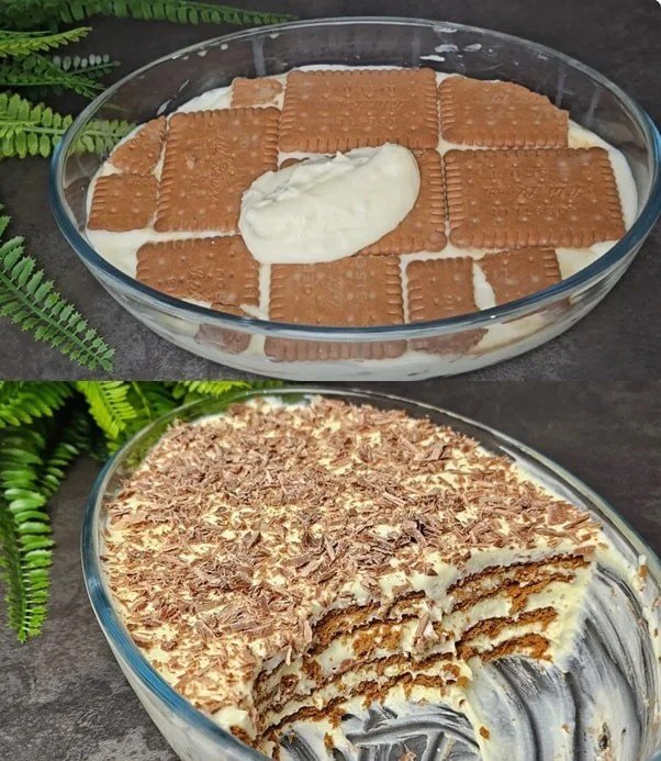 Dieses Dessert ist ein perfektes Beispiel dafür, wie man aus wenigen einfachen Zutaten ein beeindruckendes Ergebnis erzielen kann. Weiche Schichten aus Vanillecreme treffen auf zarte, leicht durchgezogene Butterkekse, die im Kühlschrank eine kuchenartige Konsistenz annehmen. Das Ergebnis ist ein samtiges, leichtes, schichtweise aufgebautes Dessert, das beim Anschneiden wunderschöne Linien zeigt, genau wie auf dem Foto.
