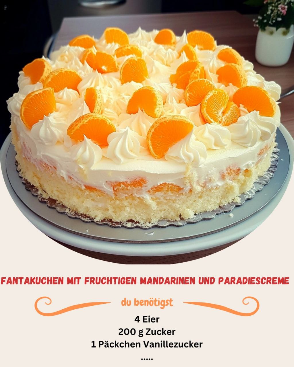 📝 Zutaten 4 Eier 200 g Zucker 1 Päckchen Vanillezucker 200 ml Fanta 200 ml Sonnenblumenöl 300 g Mehl 1 Päckchen Backpulver 2 Dosen Mandarinen (abgetropft) 2 Päckchen Paradiescreme Vanille (zum Anrühren, kein Kochen) 400 ml kalte Milch 200 ml Schlagsahne 1 Päckchen Sahnesteif 🔪 Zubereitung siehe Fortsetzung auf der nächsten Seite