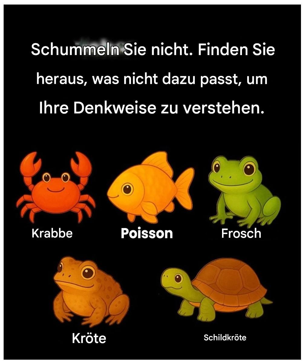 Diese kleinen visuellen Herausforderungen, die in den sozialen Medien kursieren, sind Ihnen bestimmt schon begegnet: fünf niedliche Tiere, eines, das nicht dazu passt … und am Ende eine überraschende Enthüllung. Hinter ihrem verspielten Äußeren verbirgt sich unsere Neugier: Warum wählen wir spontan das eine Tier dem anderen vor? Was steckt hinter diesem unmittelbaren Reflex? Und was wäre, wenn Ihr erster Impuls mehr über Ihre Wahrnehmung der Welt verraten würde, als Sie denken? Bevor wir die Interpretationen entdecken, stellen Sie sich diese fünf Tiere kurz vor: eine Krabbe, einen Fisch, einen Frosch, eine Kröte und eine Schildkröte. Welches erscheint Ihnen spontan „anders“? Merken Sie sich Ihre Wahl … los geht’s!