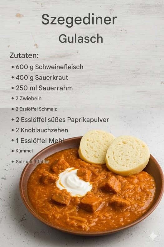 Dieses Gericht ist ein echter Klassiker aus der ungarisch-österreichischen Küche und ein perfektes Familienessen. Mit zartem Schweinefleisch, würzigem Sauerkraut und cremigem Sauerrahm erinnert dieses Szegediner Gulasch an gemütliche Sonntage bei Oma.