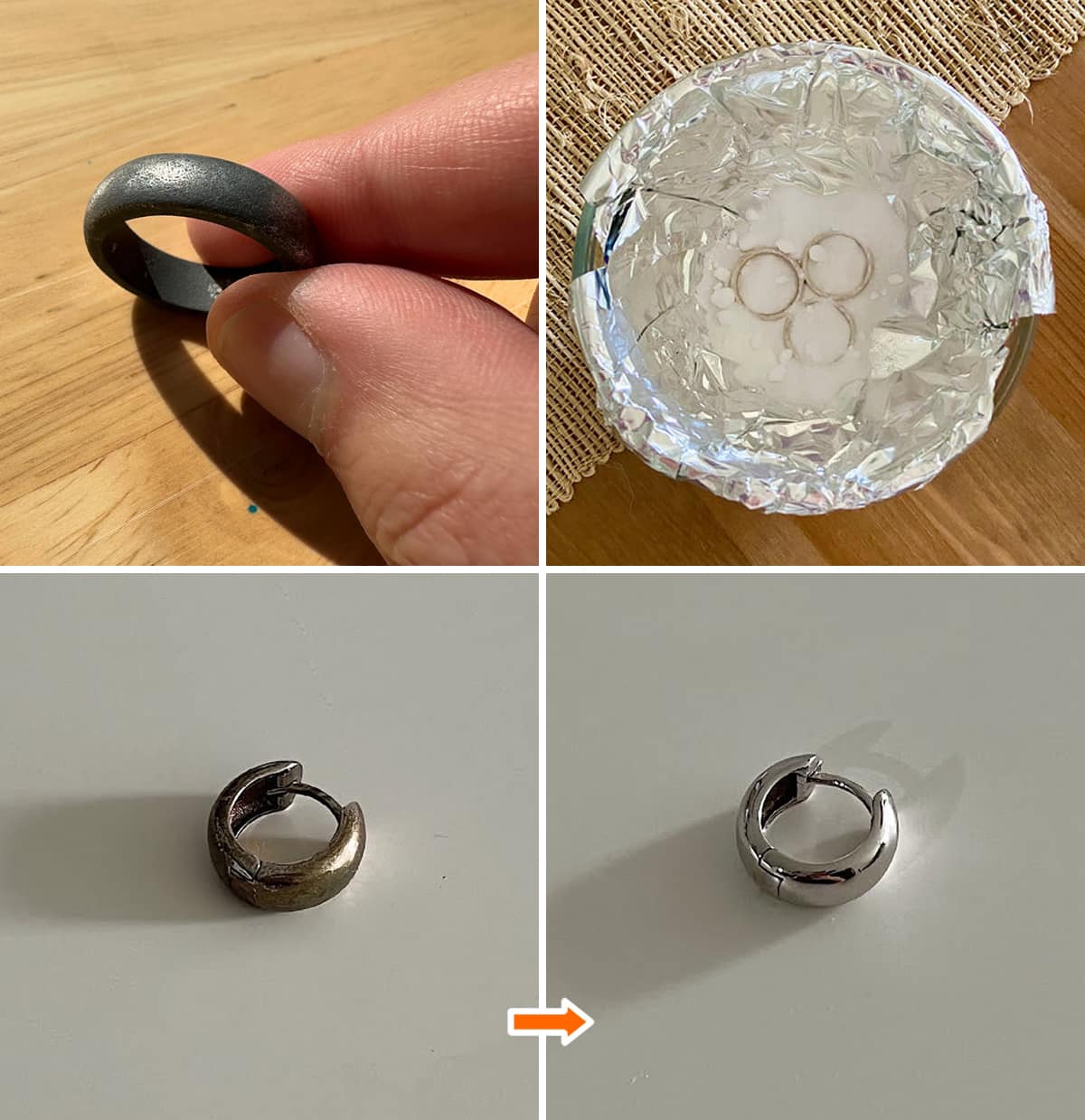 Tauchen Sie die Silberteile in die Lösung und warten Sie ca. 20 Minuten. Zum Schluss mit viel Wasser abspülen und mit einem sauberen Tuch abwischen, um Flecken zu entfernen und das Silber zu trocknen.