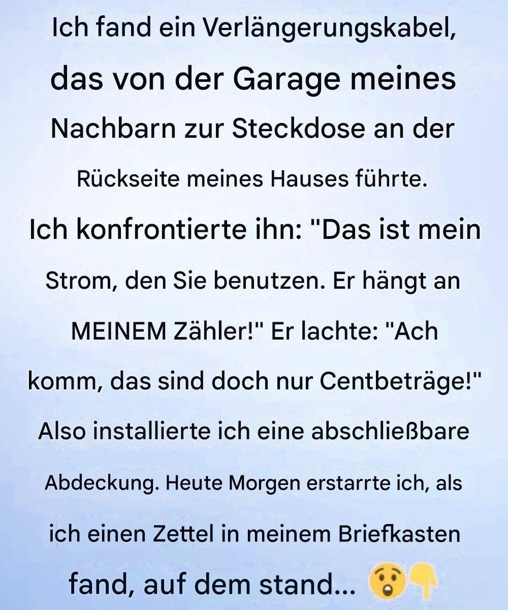 Ein orangefarbenes Verlängerungskabel spannte sich wie ein Neonpfad über meinen Rasen und führte direkt von der Garage meines Nachbarn zu meiner Steckdose an der Hauswand. Ich hielt inne, unsicher, was ich davon halten sollte. Vielleicht war es nur vorübergehend, dachte ich. Vielleicht hatten sie es eingesteckt und vergessen. Doch als ich dem Kabel genauer folgte, wurde mir klar, dass die Verbindung absichtlich hergestellt worden war – ohne mich überhaupt zu fragen. Einen Moment lang war ich eher verwirrt als verärgert – wir hatten uns immer gut verstanden.