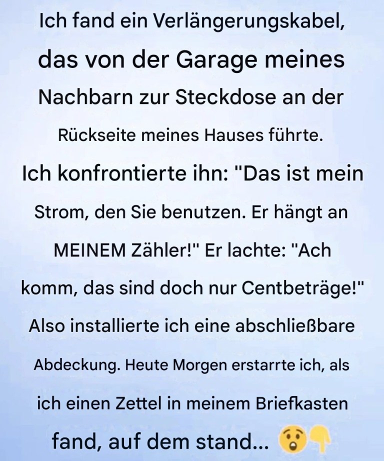 Später am selben Tag beschloss ich, die Situation ruhig anzugehen. Ich sagte zu meinem Nachbarn: „Hey, ich glaube, Sie haben versehentlich meine Steckdose benutzt – nur zur Info: Die läuft über meinen Zähler.“ Er tat es mit einem Lachen ab und meinte, es sei ja „nur ein bisschen Strom“, als ob das alles in Ordnung wäre. Ich wollte keinen Streit riskieren und habe deshalb einfach eine kleine, abschließbare Abdeckung an die Steckdose angebracht – eine einfache, respektvolle Maßnahme, um zukünftige Verwechslungen zu vermeiden.