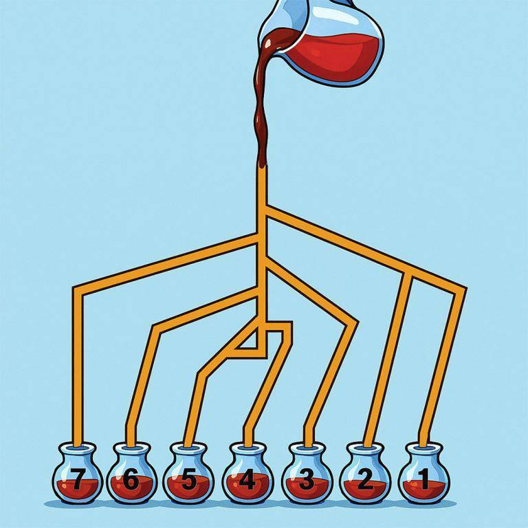 Stellen Sie sich vor: Ein Wasserhahn lässt Wasser durch ein Gewirr von Rohren fließen, die zu sieben Gläsern führen . Das Ziel: Finden Sie heraus, welches zuerst gefüllt wird .