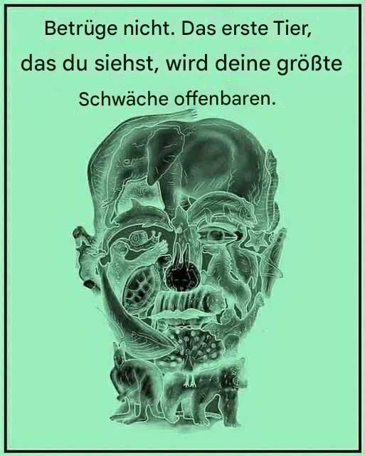 Das unten gezeigte Bild ähnelt auf den ersten Blick einem menschlichen Gesicht. Bei genauerem Hinsehen erkennt man jedoch, dass es aus verschiedenen Tierfiguren zusammengesetzt ist. Jedes dieser Tiere steht symbolisch für bestimmte Persönlichkeitsmerkmale oder Verhaltensneigungen. Das Tier, das Ihnen als Erstes ins Auge fällt, kann Hinweise darauf geben, welche Eigenschaften bei Ihnen besonders ausgeprägt sein könnten.